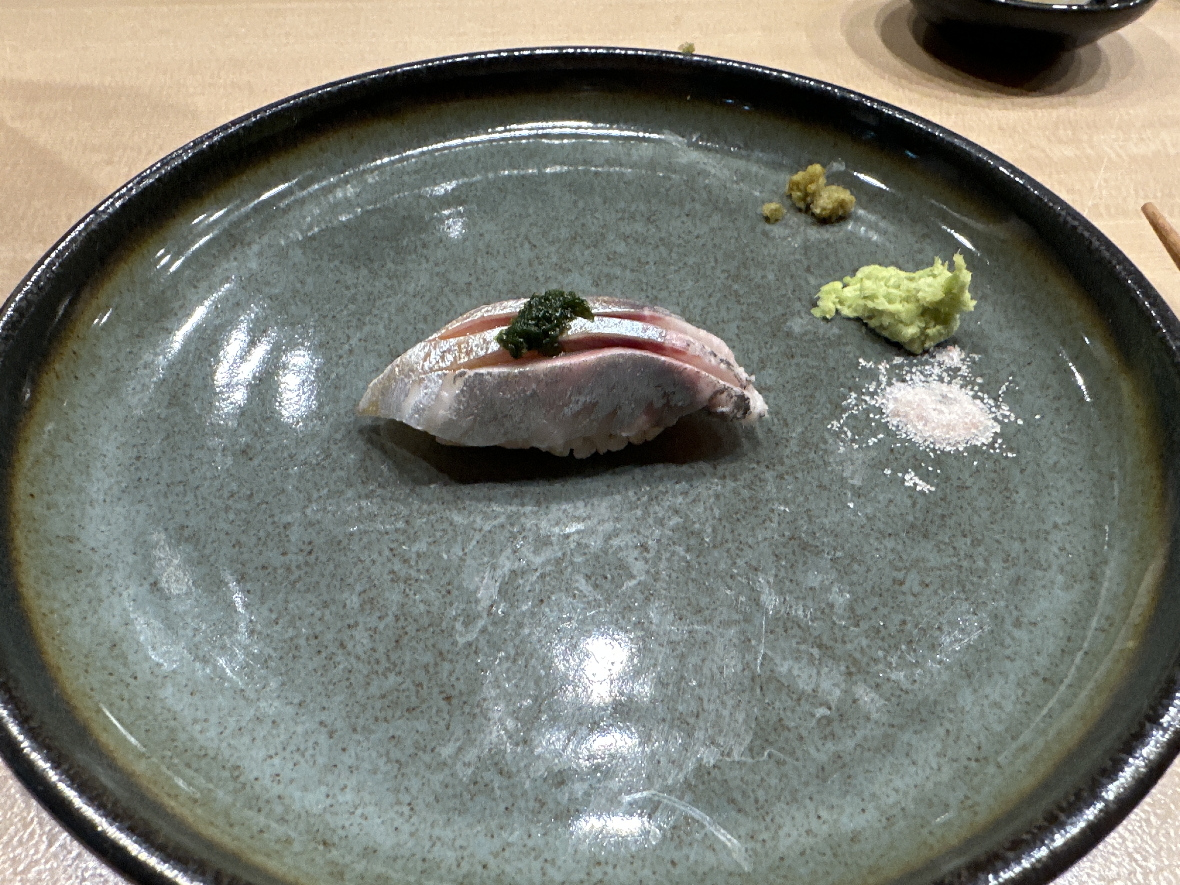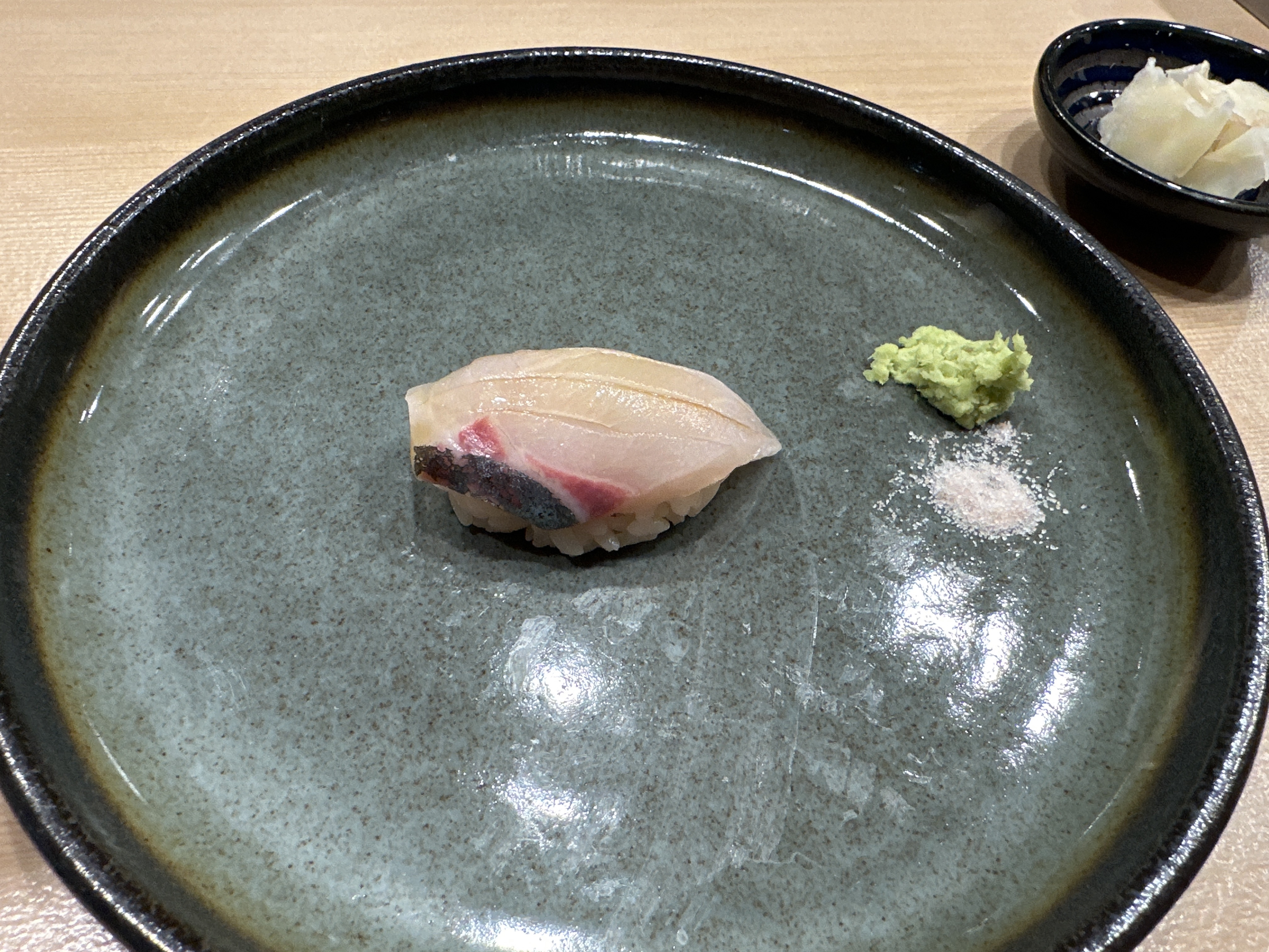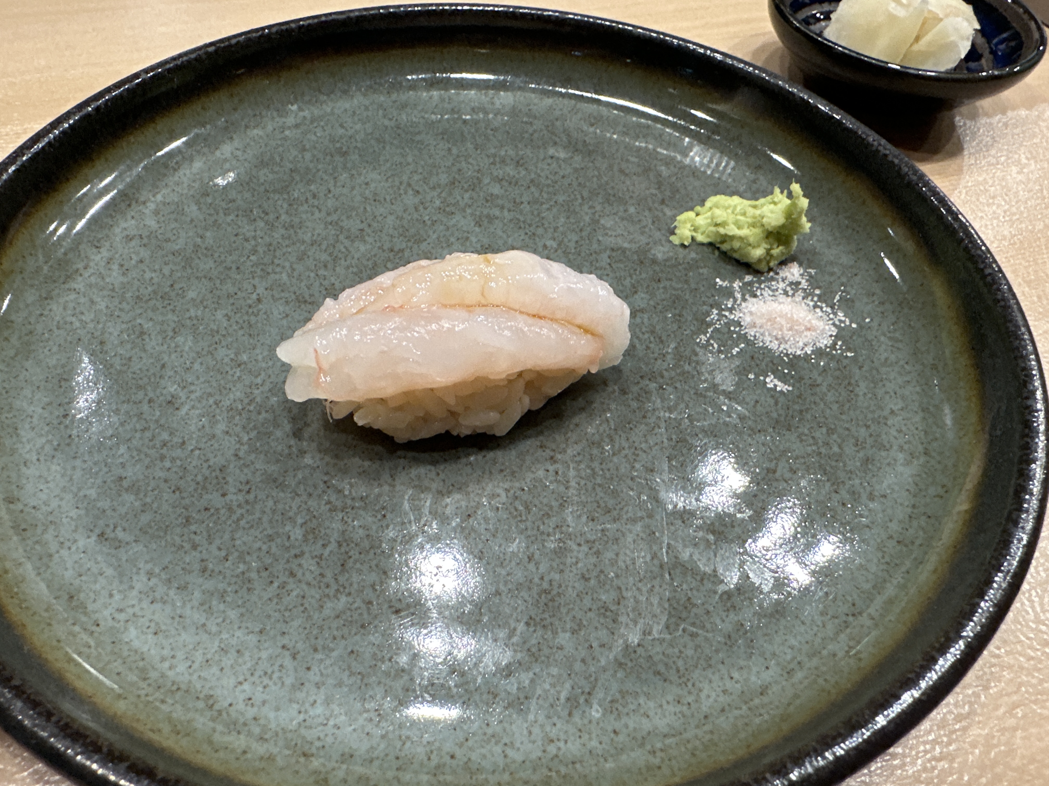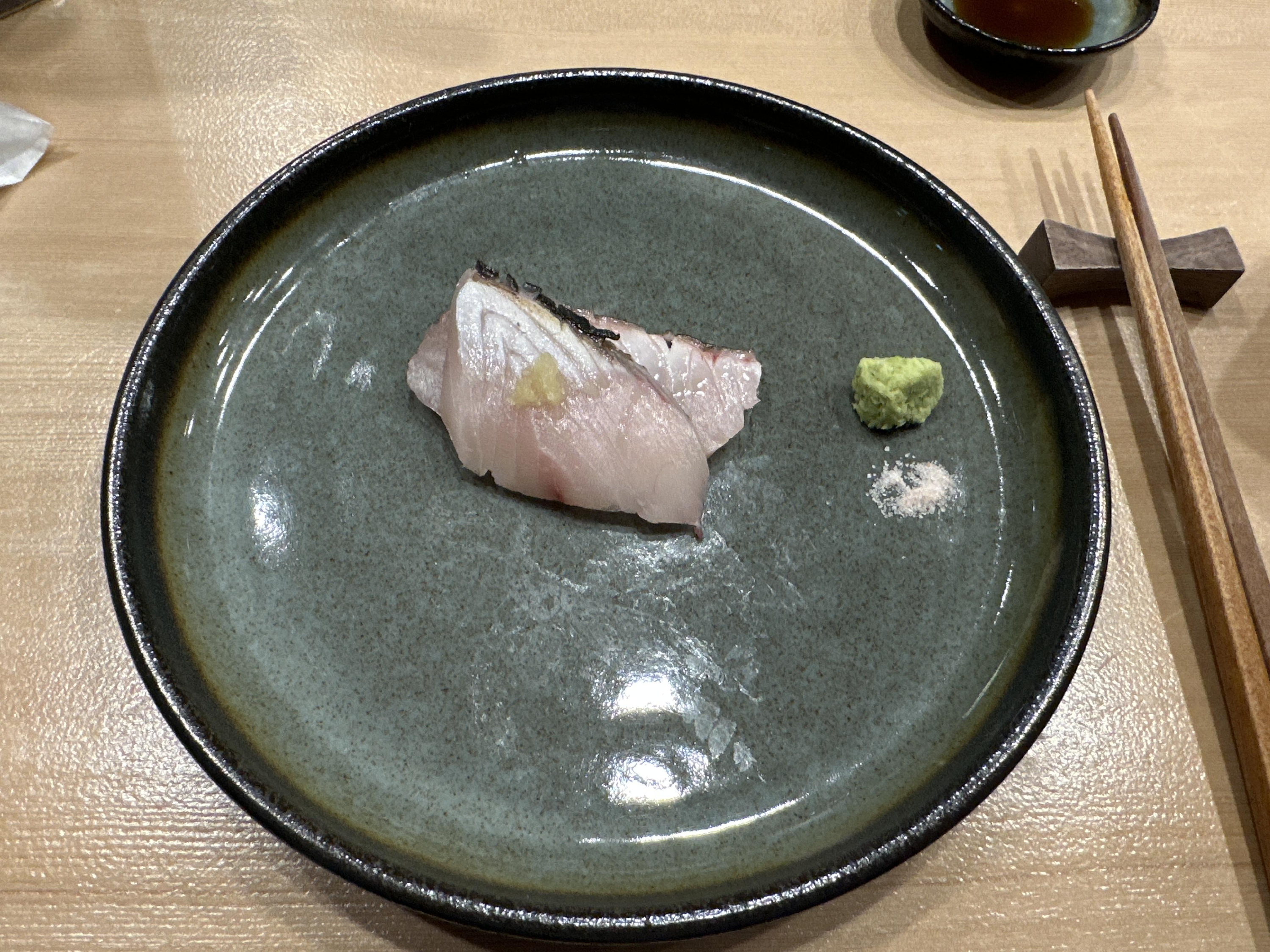 오마카세 단골생선 줄무늬전갱이 ㅎㅎㅎ 전갱이보다 식감이 살아있어서 좋아하는 스시입니다.