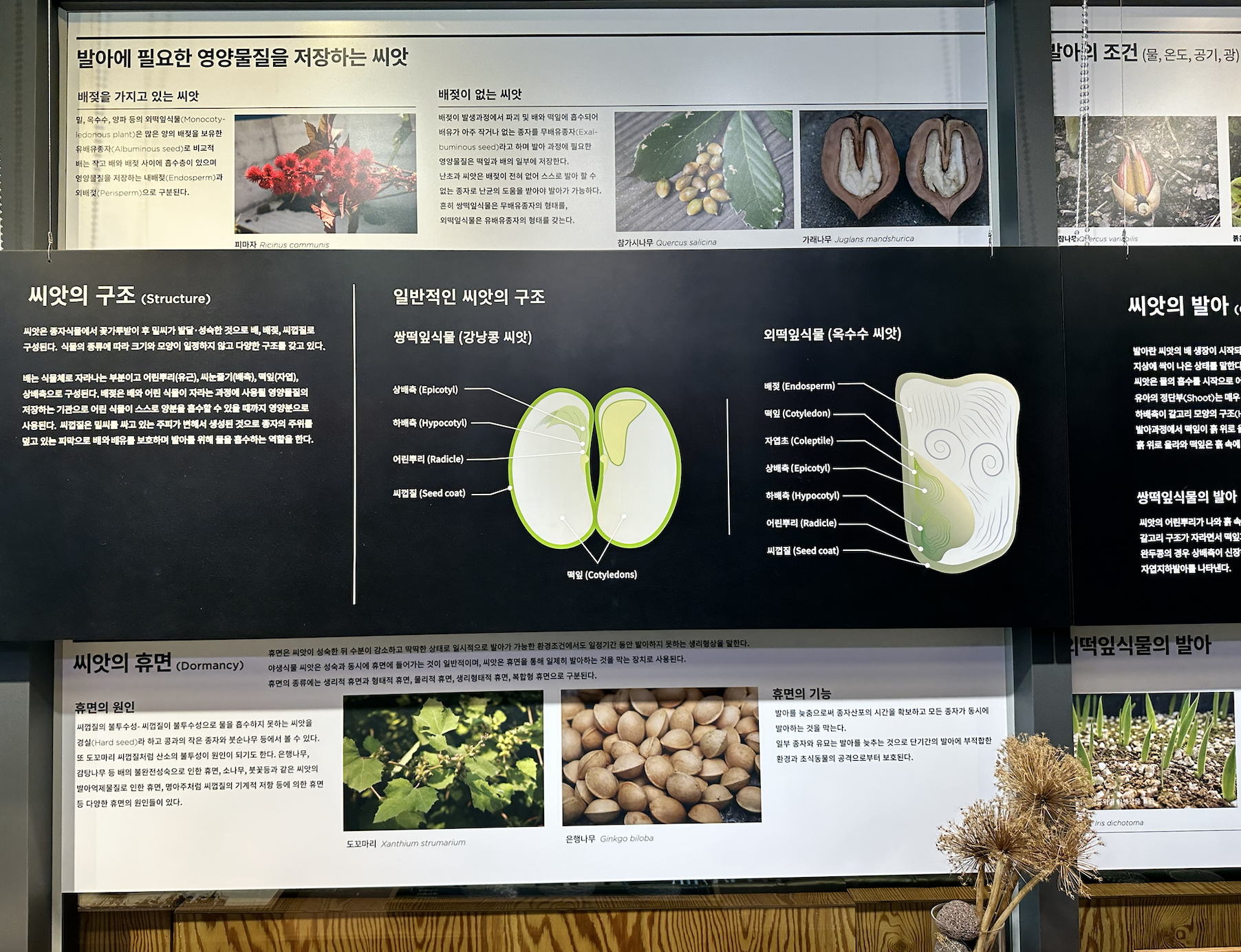 씨앗도서관에는 다양한 씨앗이 전시되있고, 씨앗에 대한 다양한 설명도 있어요.