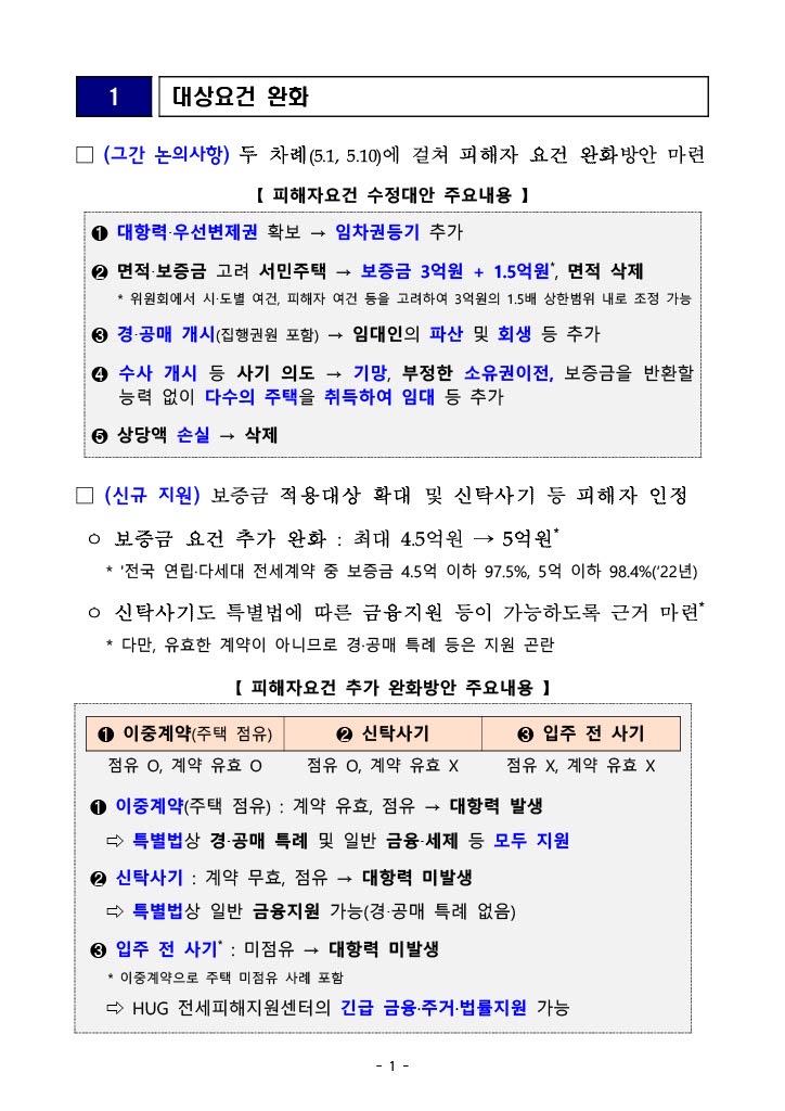 집주인 파산 및 회생 사례를 포함하도록 피해자 요건이 확대되었습니다. 이전에는 경매 또는 공개 판매의 개시만이 피해자 요건으로 간주되었습니다. 이제 임대인의 파산이나 회생 절차와 관련된 사건도 인정됩니다. 또한 사기 없이는 반환할 수 없는 상태에서 대량의 부동산을 취득·임차한 개인에게 임대주택의 소유권을 이전하는 등의 경우도 특별법상 전세사기로 인정됩니다.