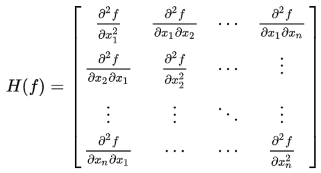 헤시안 행렬은 함수의 두 편미분을 이용하여 구성되며, 함수의 극값, 극솟값, 안장점 등을 분석하는 데에 사용됩니다. 함수 f(x, y)의 헤시안 행렬 H는 다음과 같이 정의됩니다