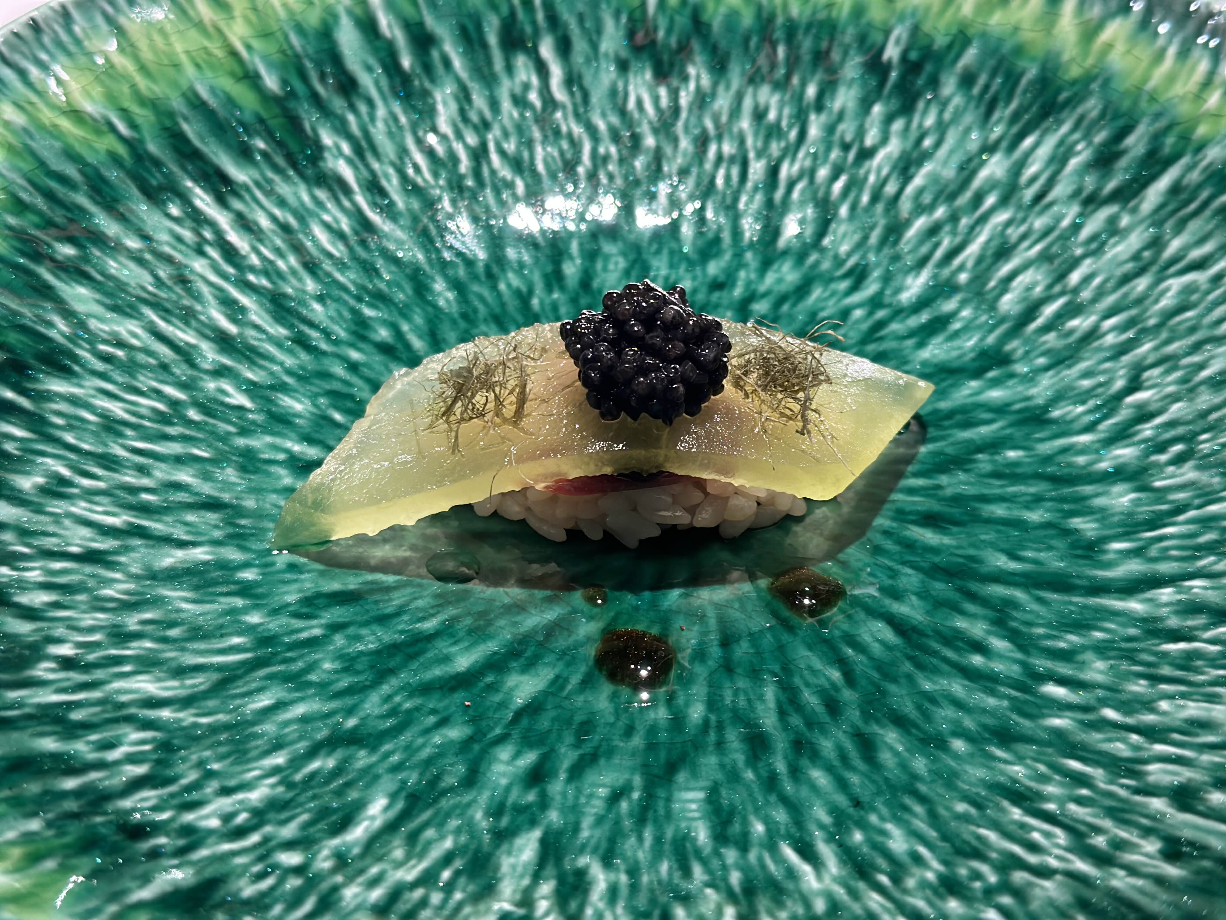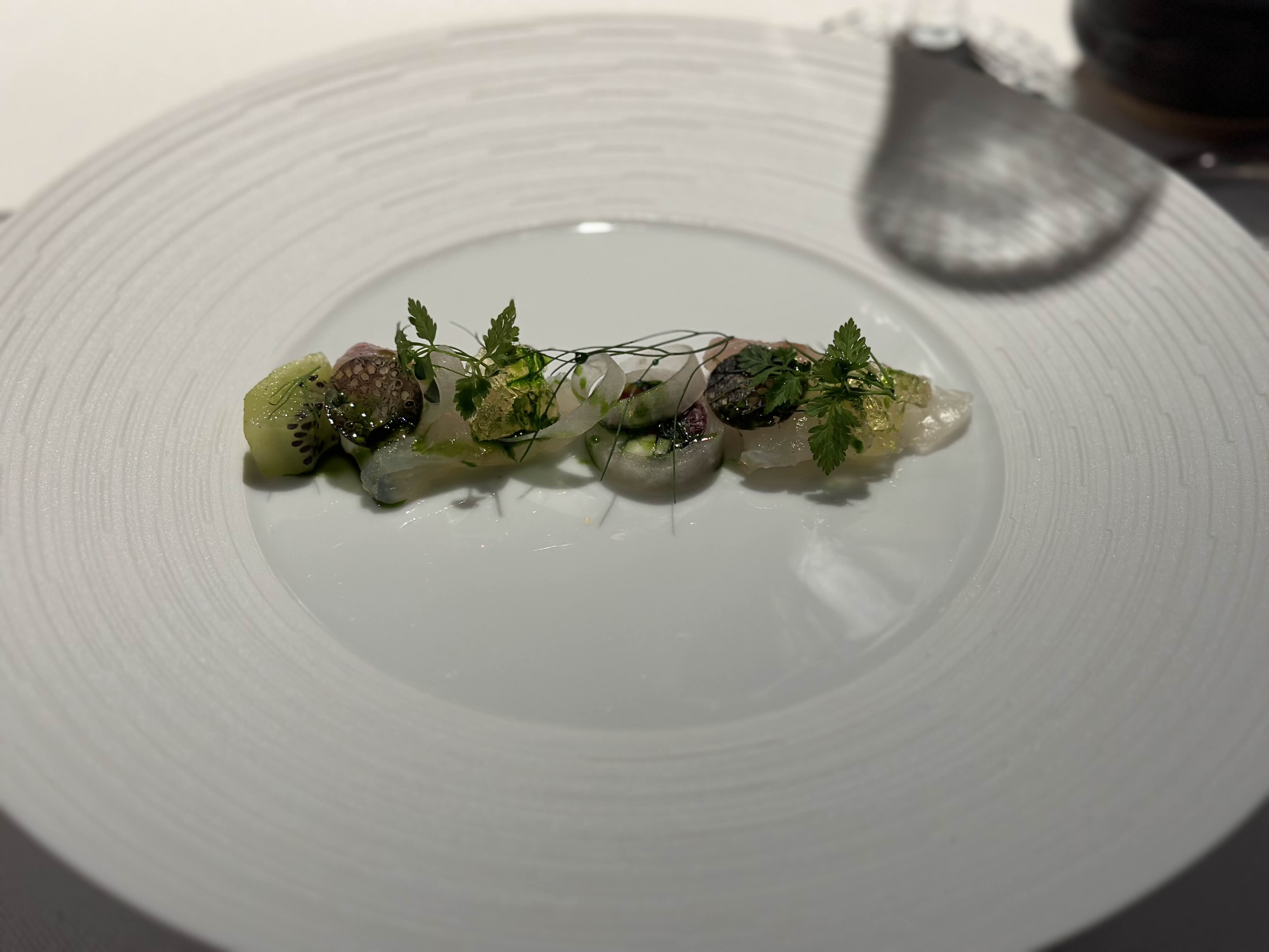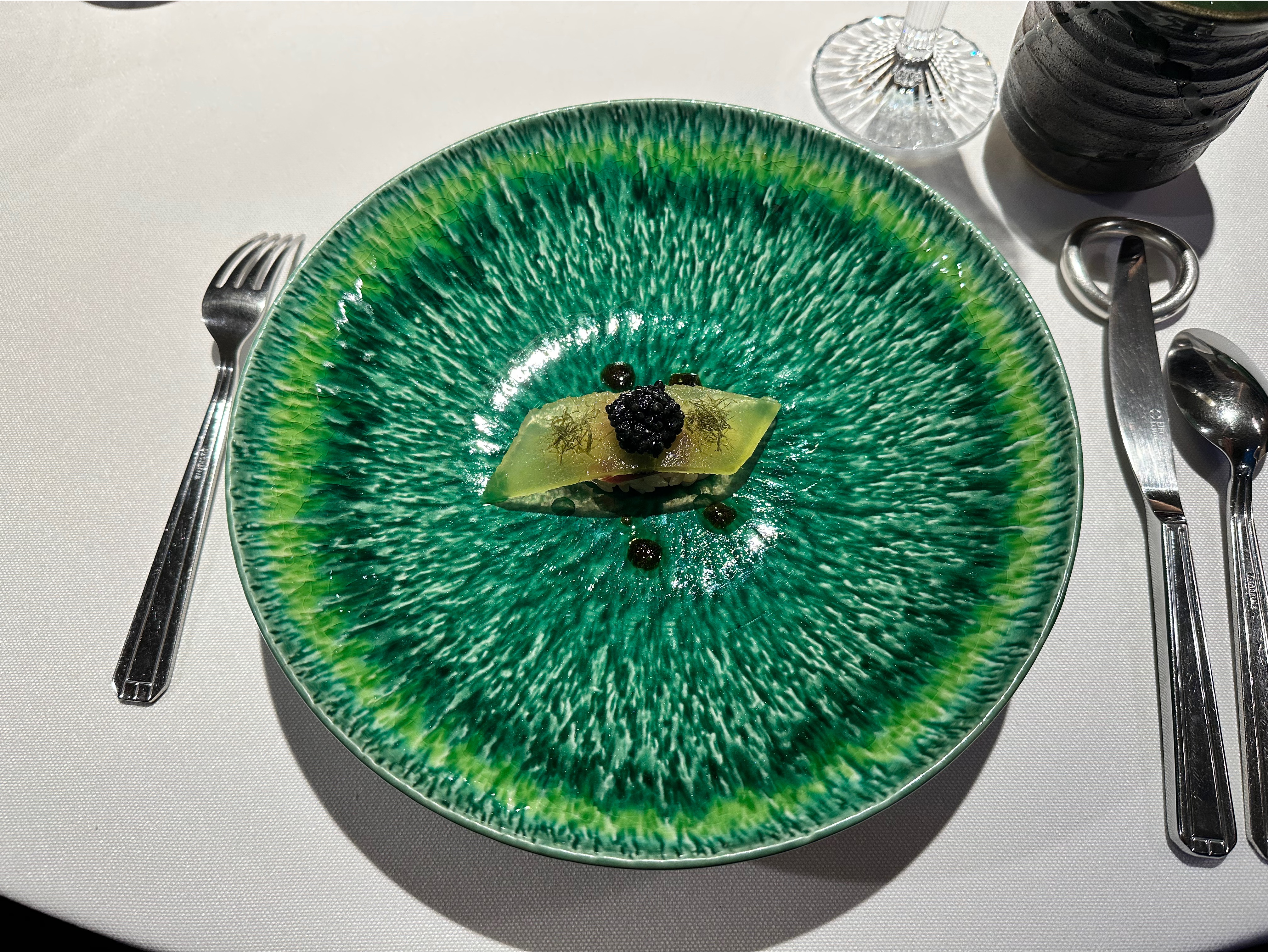 압착 캐비아, 샤프란 젤리, 키위와 곁들인 도미 요리입니다