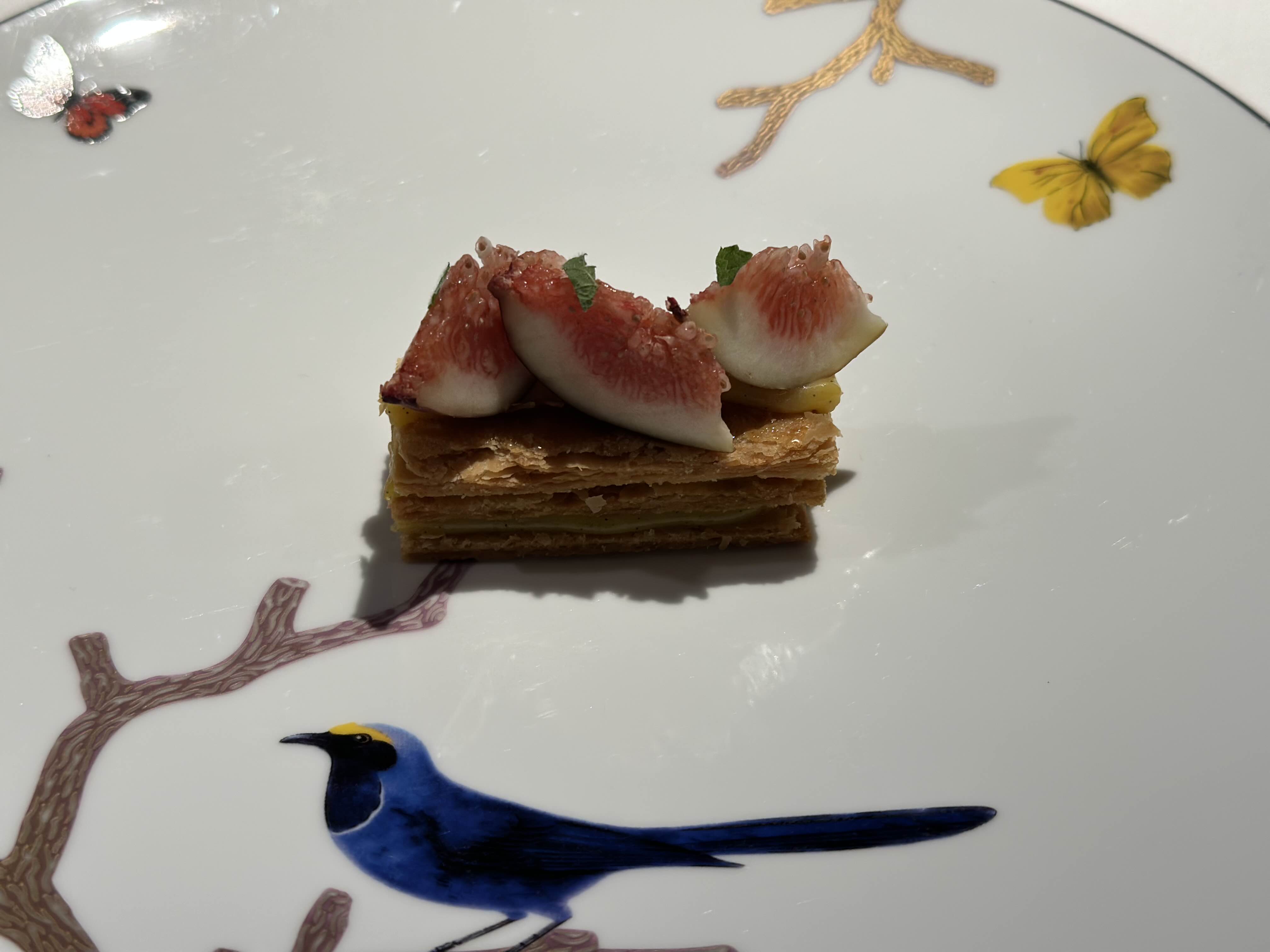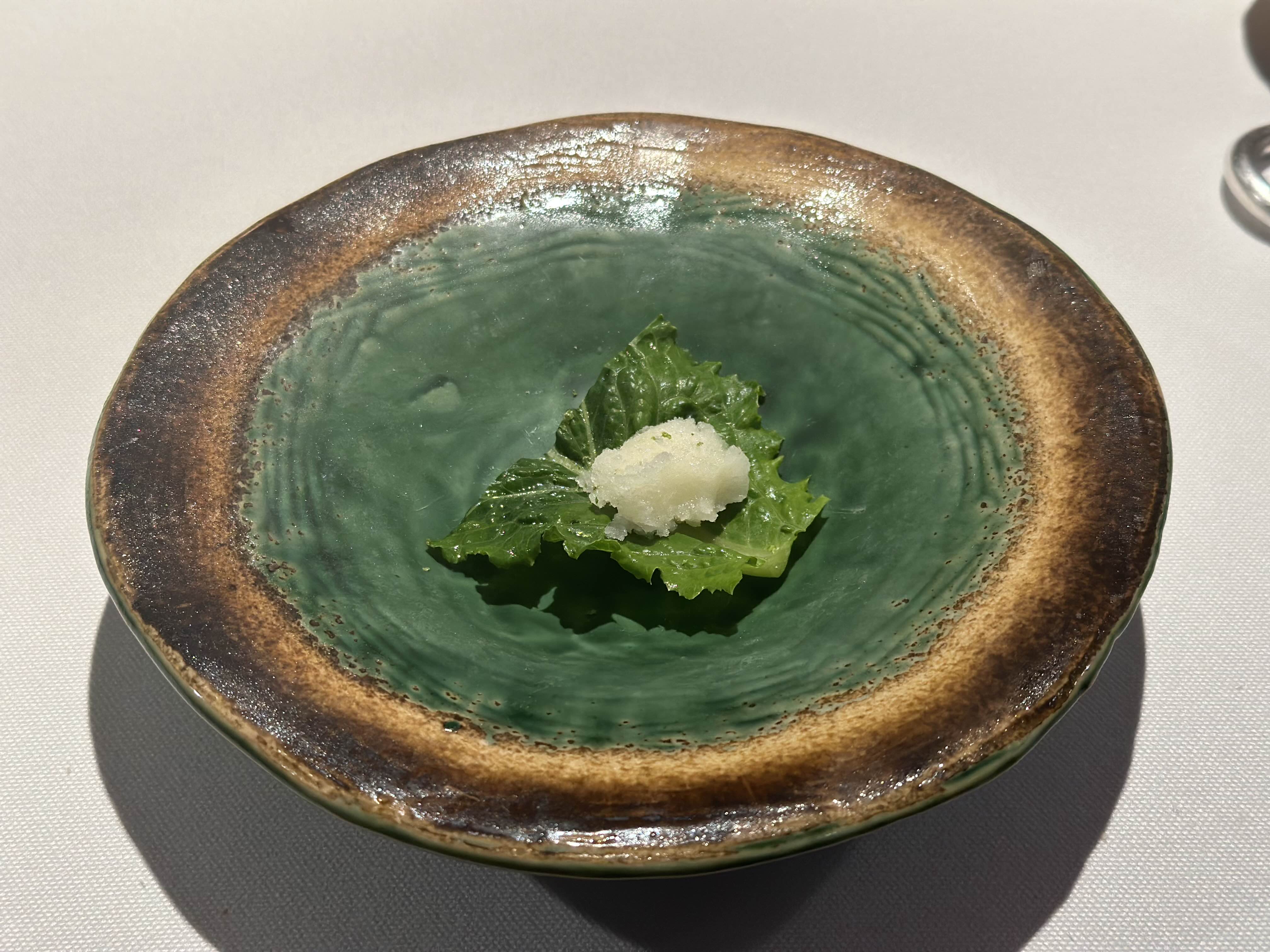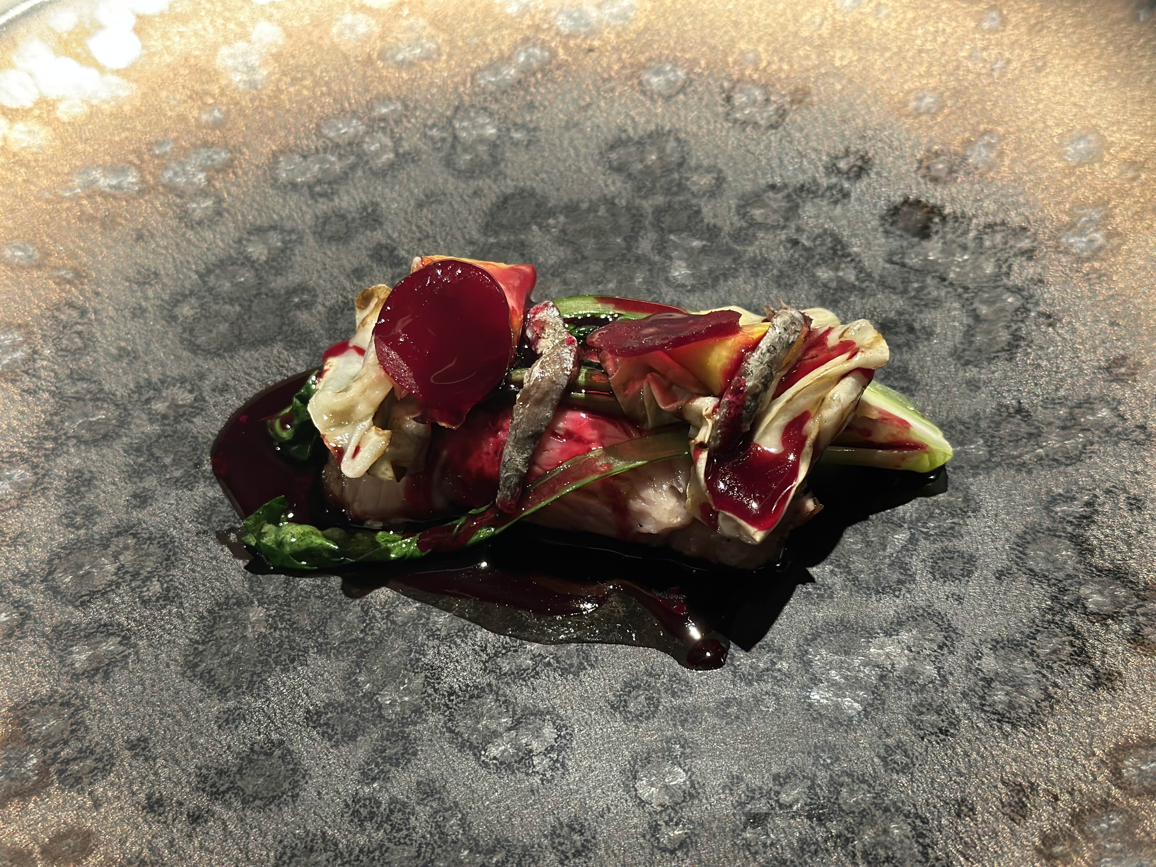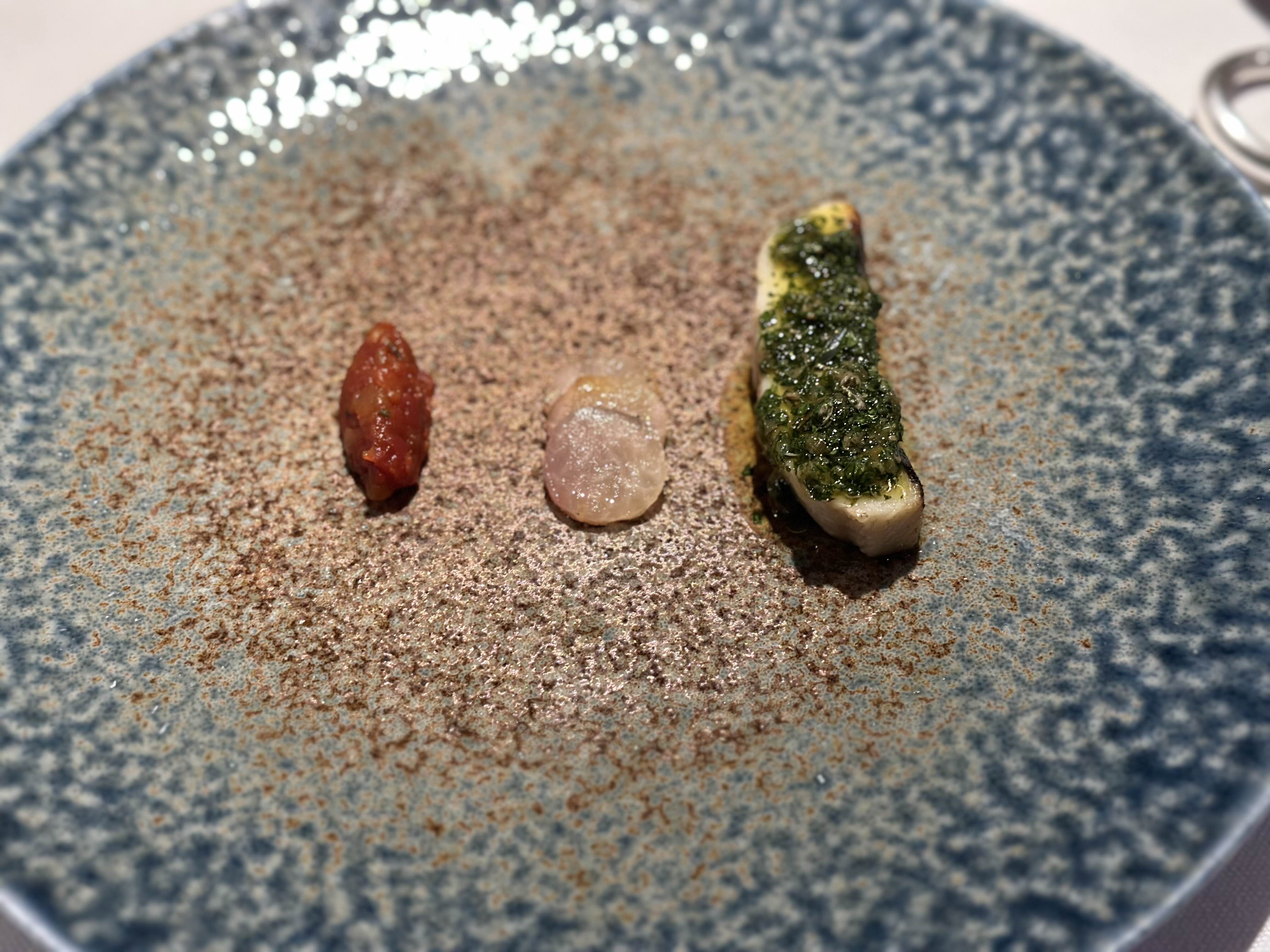 압착 캐비아, 샤프란 젤리, 키위와 곁들인 도미 요리입니다
