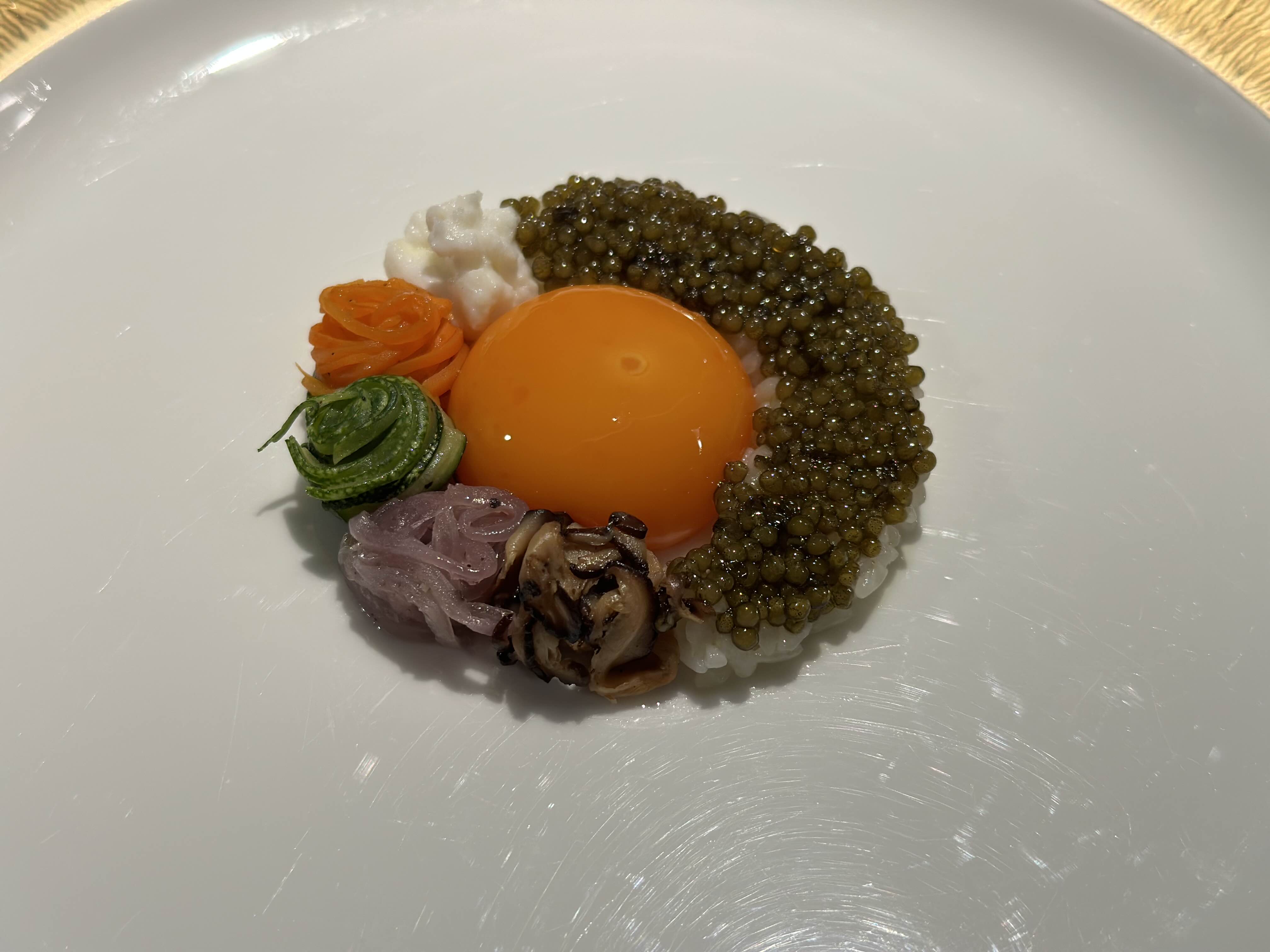 와인마리네이드 라이스 위에 하몽, 메롱, 캐비어를 올린 요리입니다