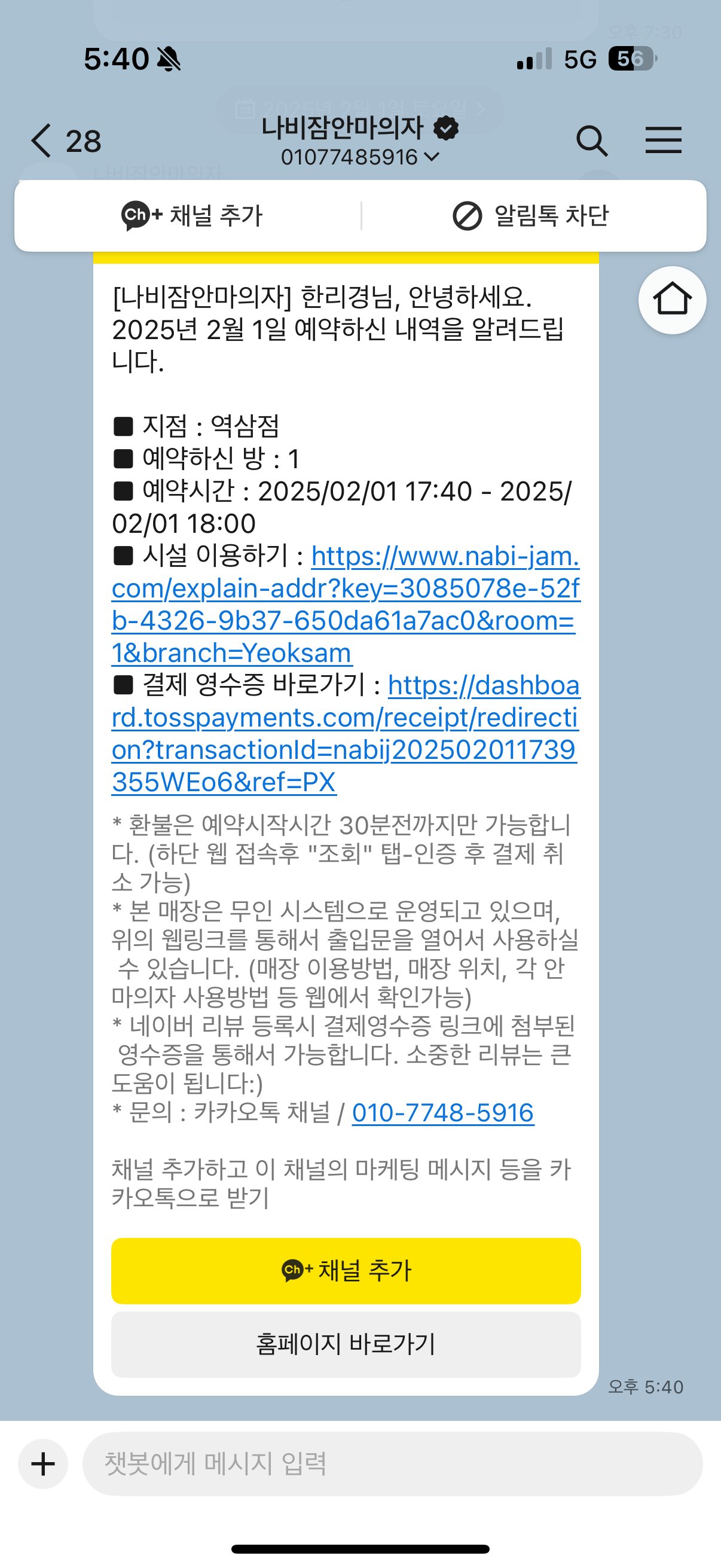 3. 예약 과정에서 휴대폰번호를 입력하는데, 이 휴대폰번호에 연동된 카카오톡을 통해 건물 비밀번호, 가게와 예약한 방을 열 수 있는 버튼? 이 전달됩니다