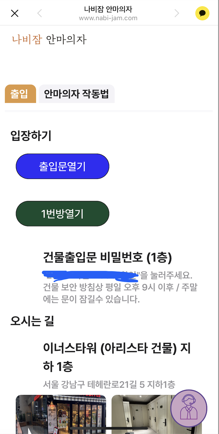 카톡으로 전달된 링크 중 '시설 이용하기'링크를 누르면 이렇게 출입과 안마의자 작동방법이 자세히 적힌 링크가 온답니다!