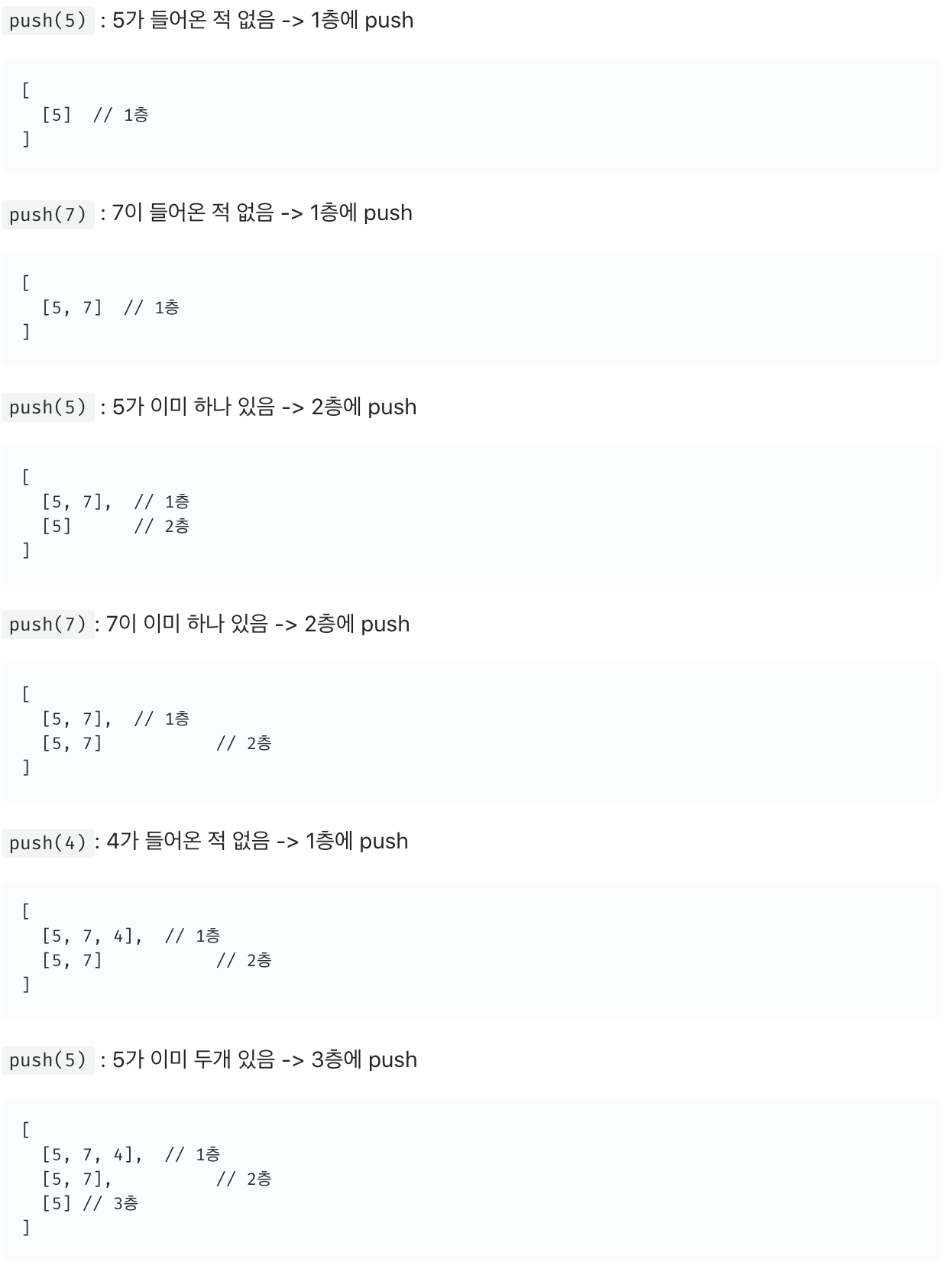 stack์ด ์ธต ๋ณ๋ก ๋์์ง ํํ์ธ๋ฐ, ๊ฐ N์ธต์ stack์ N๋ฒ์งธ๋ก ๋ค์ด์จ ์์๋ค๋ผ๋ฆฌ์ stack์ด๋ผ๊ณ ๋ณด๋ฉด ๋ฉ๋๋ค.