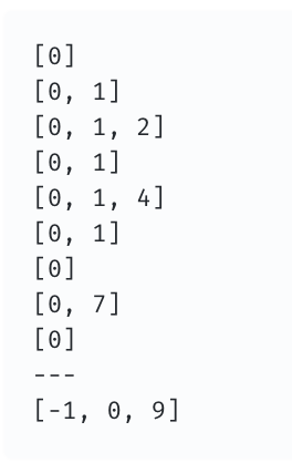 // ex1) )))()()(( => [-1, 0, 1, 2, 7, 8, 9]