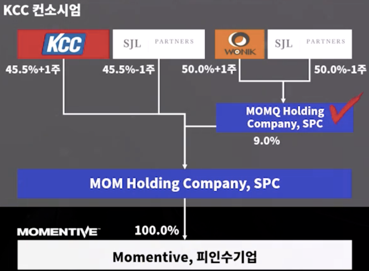 MOMQ홀딩 컴퍼니를 설립한 건 실리콘 사업과 석영 사업의 분리를 위해서였다. KCC컨소시엄은 모멘티브 인수 완료 후 바로 실리콘사업과 석영사업의 분리를 시작하는데, 그 첫단계는 MOMQ Holding Company가 MOM Holding Company의 지분관계를 청산하는 것이었다. MOMQ홀딩 컴퍼니는 MOM 홀딩 컴퍼니와 지분관계를 청산하고 현금이 아닌 약속 어음을 받았다.