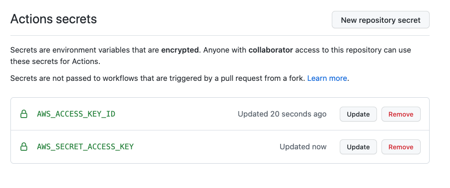 ์๊น S3์์ ์์ฑํ key id์ secret์ ๊ฐ๊ฐ AWS_ACCESS_KEY_ID, AWS_SECRET_ACCESS_KEY ์ด๋ฆ์ผ๋ก ๋ฑ๋กํฉ๋๋ค.