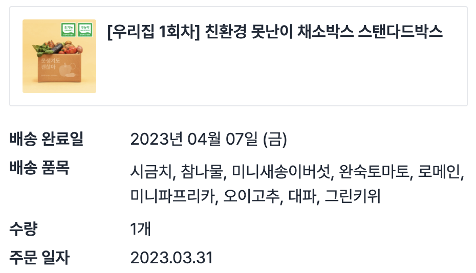 1회차때는 기본 구성 채소를 그대로 받았고, 2회차부터는 마트에서 구하기 쉬운 채소는 빼고 잘 안먹는 채소들을 좀 더 넣는식으로 구성을 바꿔서 받았어요.
