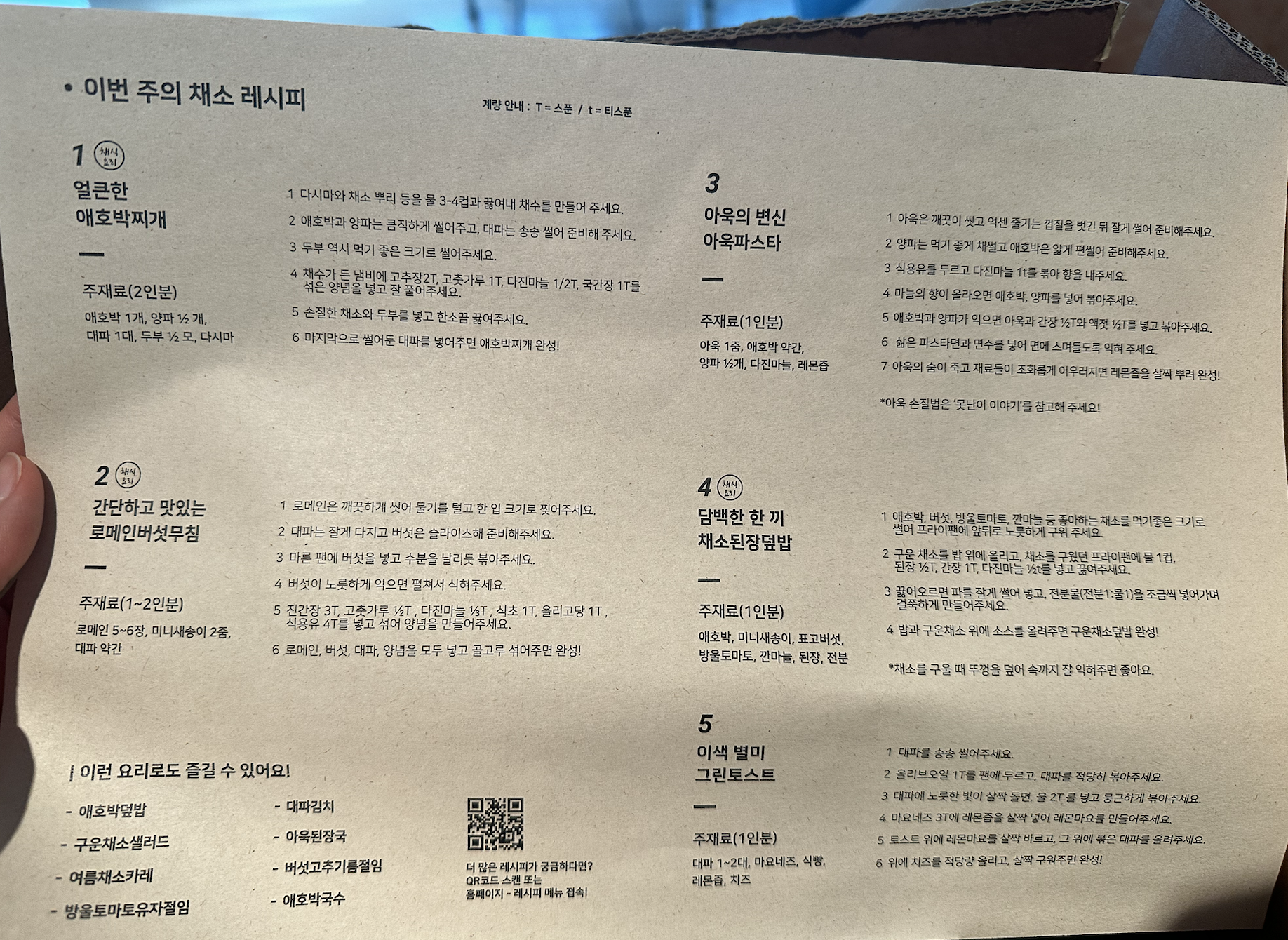 레시피용지에는 이번주의 채소로 할 수 있는 요리와 채소들의 사연이 적혀있어요.