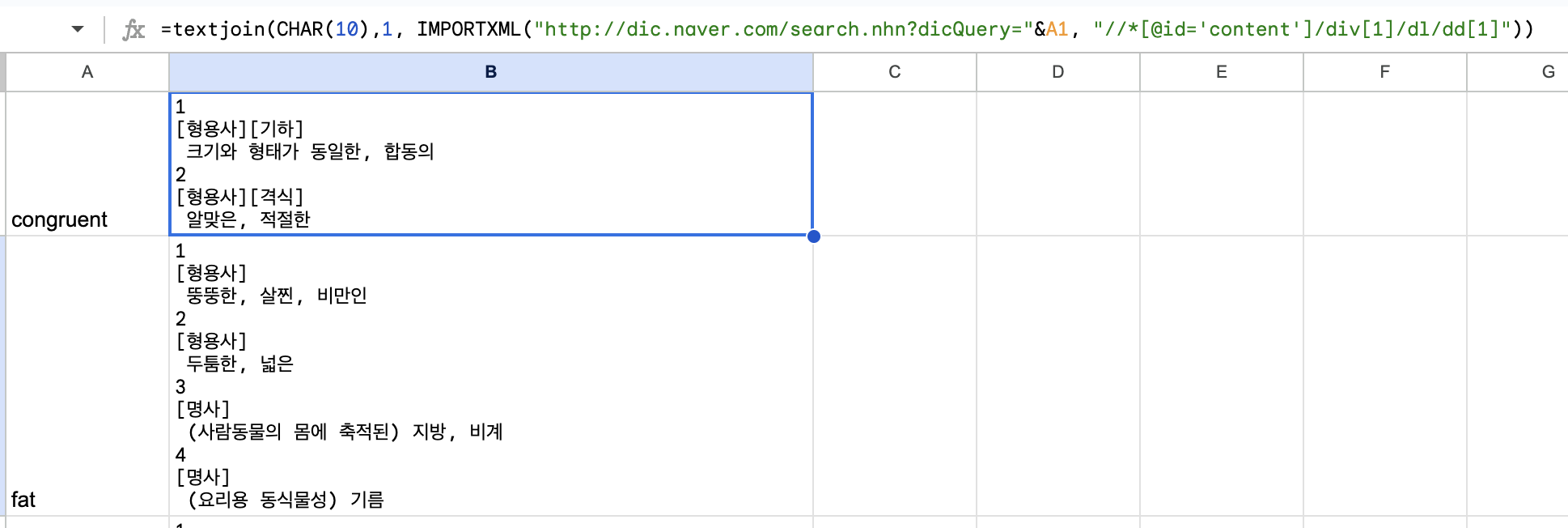 하나의 셀에 하나의 단어 뜻이 깔끔하게 나오네요.