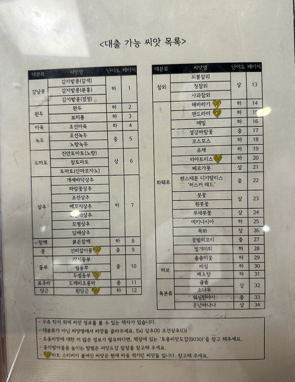 씨앗도서관에 가면 대출 가능한 씨앗 리스트와 난이도를 같이 보여주십니다.