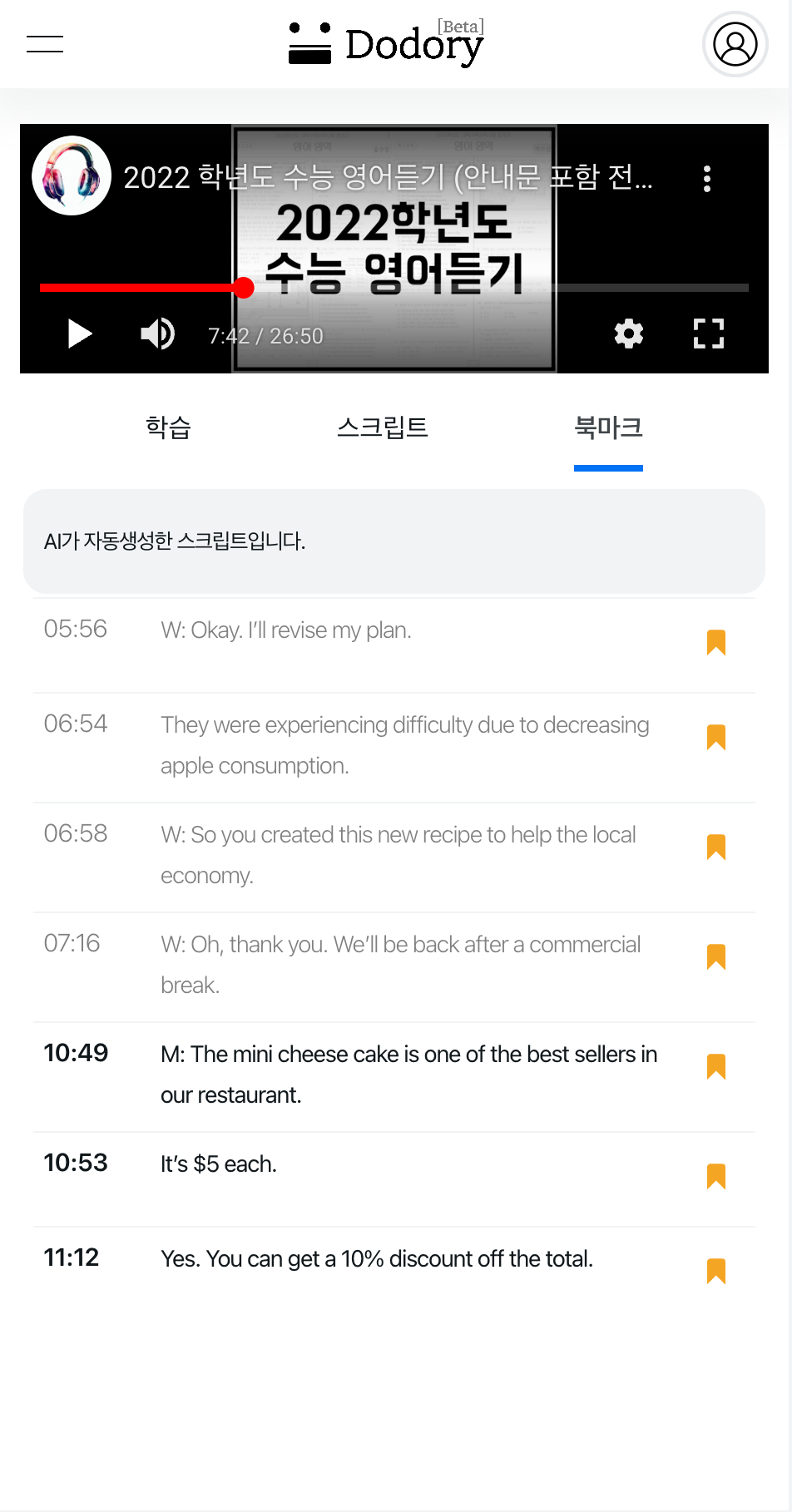 기능1. 모르는 문장 북마크하면서 들을 수 있는 학습모드