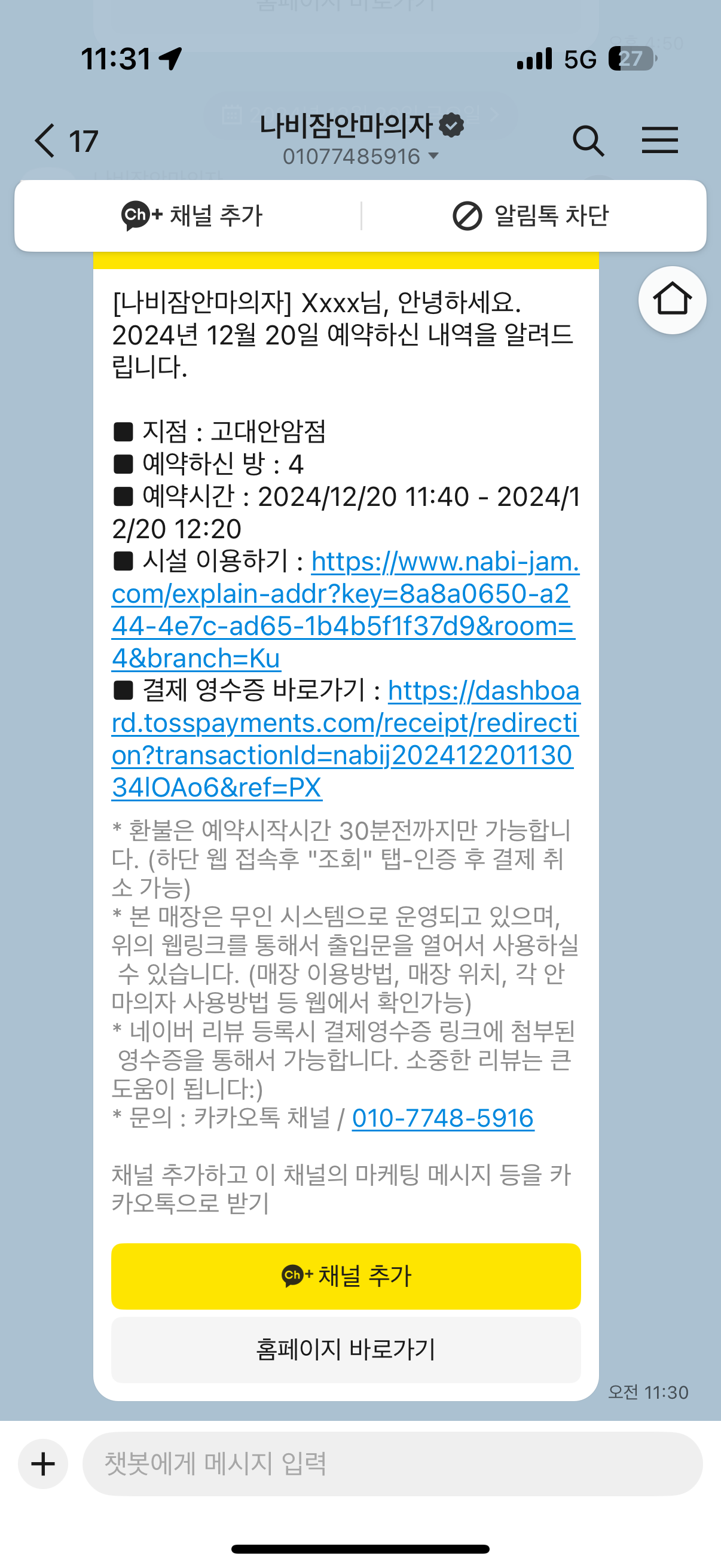 여기서 '시설 이용하기'링크로 들어가면 매장에 들어갈 수 있는 버튼과 예약한 안마의자 작동법이 적혀 있어요!