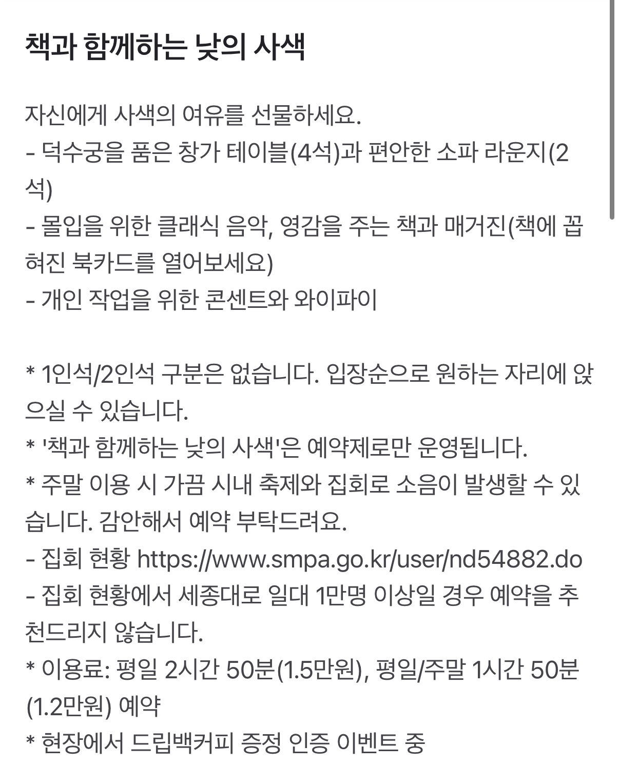 • 특이 사항: 낮 시간 대화 금지, 외부 음식 반입 불가, 음료 반입 가능