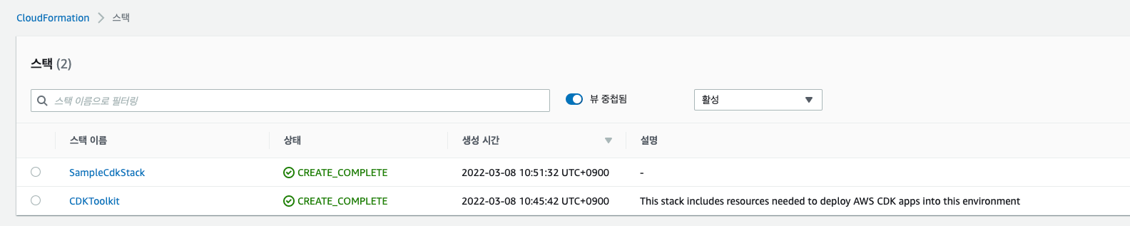 cdk deploy ์ปค๋งจ๋๋ฅผ ์คํํ๋ฉด ํ์ฌ๊น์ง ์์ฑํ ์คํ์ด aws์ ๋ฐฐํฌ๋ฉ๋๋ค.